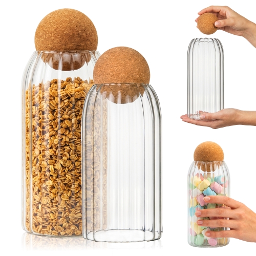 2x Pojemniki szklane ryflowane 870 ml + 1,4 L do przechowywania żywności z korkową kulką