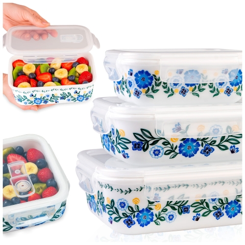 3x Szklane pojemniki do przechowywania żywności - niebieskie kwiaty