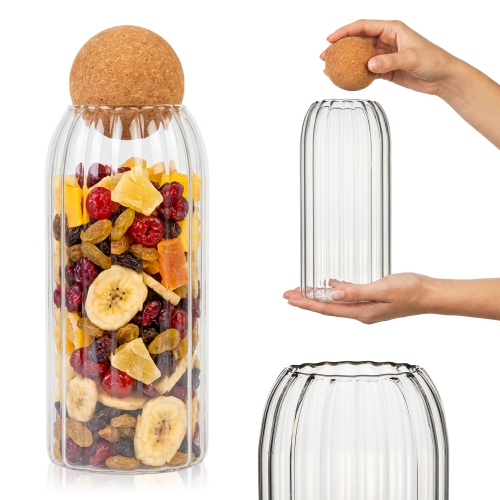 Pojemnik szklany ryflowany 1,4 L do przechowywania żywności z korkową kulką