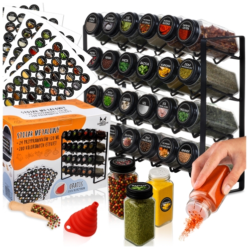 Przyprawnik, metalowy stojak FALA 4 poziomowy + 24x słoiczki na przyprawy + 200x naklejki + lejek + łopatka GRATIS