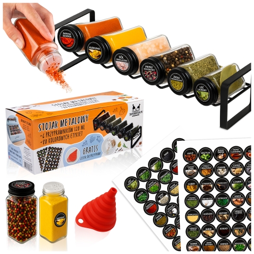 Przyprawnik metalowy stojak FALA + 6x słoiczki na przyprawy + 80x naklejki + lejek GRATIS