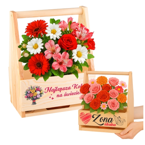 Skrzynka drewniana nosidło na kwiaty, butelki, box, prezent na walentynki z nadrukiem