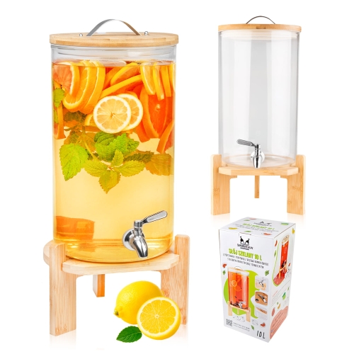 Stylowy i pojemny słój szklany o pojemności 10 litrów z bambusową pokrywką, kranikiem ze stali nierdzewnej i solidnym drewnianym stojakiem to doskonałe rozwiązanie do serwowania lemoniady, kombuchy, ponczu, wina i innych domowych napojów. Zintegrowany termometr oraz odpowietrznik w pokrywie zapewniają wygodę i kontrolę, a elegancki design sprawia, że zestaw doskonale prezentuje się na stole – w domu, ogrodzie czy podczas przyjęcia. To funkcjonalność, trwałość i estetyka w jednym.
