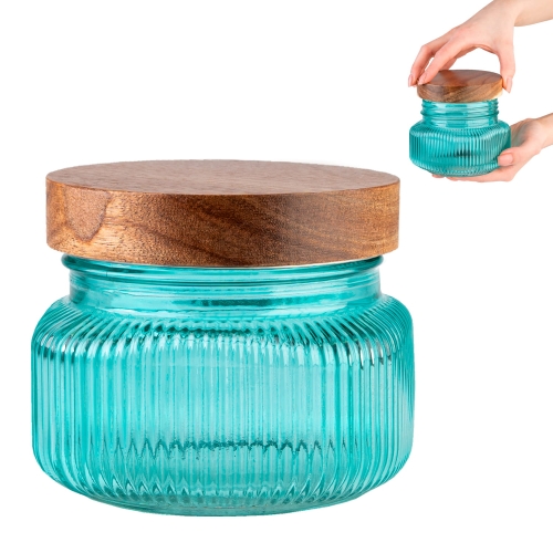 Szklany pojemnik ryflowany 0,5l na żywność, do przechowywania, dekoracji z drewnianą zakrętką - turkusowy