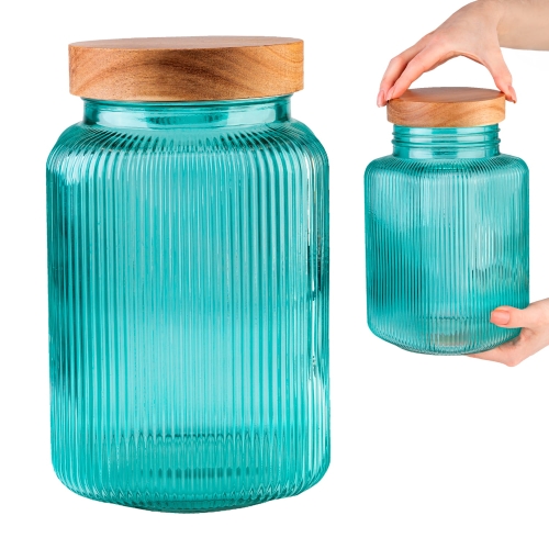 Szklany pojemnik ryflowany z drewnianą zakrętką 3 L do przechowywania żywności TURKUSOWY
